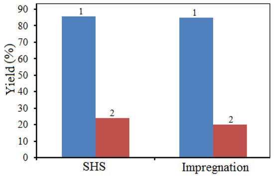 A study of the activity of 30% Cο(ΝΟ3)2 + 70% Al(NO3)3 + urea catalysts prepared by SHS and incipient wetness impregnation methods in dry reforming of methane was carried out at 850 and 900 °C. The results on the yield of hydrogen and CO for these catalysts at a space velocity of 3300 h−1 are presented in Figure 11.