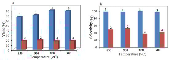 The results show that 100% CH4 conversion was observed on a catalyst containing 30% Co(NO3)2 + 70% Αl(NO3)3 at the highest temperature. This catalyst also showed 100% conversion of CO2. The H2/CO ratio of the reaction products was 0.8–1.2 for both catalysts. An increase in the reaction temperature led to an increase in the H2/CO ratio. The 1:1 ratio is very important for the production of dimethyl ether, which can be used as a fuel. Conversion of CH4 was also 100% at 900 °C in the presence of the 60% Co(NO3)2 + 40% Al(NO3)3 catalyst, while CO2 conversion reached only 86.2%. The yield of H2 increased to 99.2% and yield of CO was 85.4%” instead of “The yields of H2 and CO were 99.2% and 85.4%, respectively (Figure 8). Tests on the 30% Co(NO3)2 + 70% Al(NO3)3 catalyst showed that the maximum 100% conversion of CH4 and CO2 were achieved. The yields reached 99.2% H2 and 99.1% CO at 900 °C (Figure 8).
