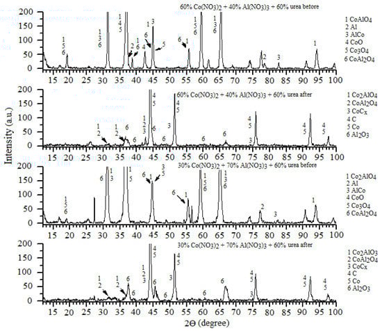 Composition of the catalysts was examined by XRD after each experiment (Figure 13). Mass of the 60% Co(NO3)2 + 40% Al(NO3)3 + 60% urea and 30% Co(NO3)2 + 70% Al(NO3)3 + 60% urea catalysts after the catalytic reaction decreased by 3.9% and 11.11%, respectively. It follows from the X-ray spectrum that carbon is formed after the experiments in addition to cobalt carbide, CoCx. In this case, the cobalt oxide disappears after the experiments, concomitant with the appearance of cobalt. Cobalt oxide is thus reduced to Co. This reaction causes a decrease in the weight of the catalyst after experiments.