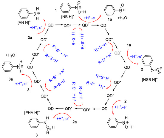 In early 2016, Weiss et al. [27] explored the reduction reaction of nitrobenzene to aniline with CdS QDs (diameter = 4.5 nm) as visible-light photocatalysts and 3-mercaptopropionic acid (MPA) as sacrificial agents. Notably, nitrobenzene experienced six sequential photoinduced, proton-coupled electron transfers. MPA here captured the hole on the QDs to form QD•− and then the electron was transferred to nitrobenzene or the intermediates nitrosobenzene and phenylhydroxylamine to the final product aniline (Scheme 1). Interestingly, the reaction system maintaining an acidic pH not only solved QDs poisoning due to adsorption of the photoproduct aniline on the QDs surface, but promoted protonation of intermediates.