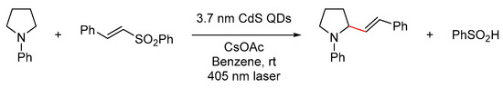 In 2017, Weiss et al. [29] developed a ligand-dependent C–C coupling reaction between 1-phenyl pyrrolidine and phenyl trans-styryl sulfone, with the participation of photocatalyst CdS QDs (diameter = 3.7 nm). No sacrificial agents or co-catalyst were needed (Scheme 2). Holes transferred to 1-phenyl pyrrolidine through the surface of QDs were proven by kinetic analysis to be a rate-limiting step, and that the product increased linearly with the concentration of 1-phenyl pyrrolidine (that is, the initial rate) in the first 15 min. For this reason, the ligand shell of the QDs was key to the rate of entire reaction. They added octylphosphonate ligands to replace some native oleate ligands of CdS QDs by a one-step ligand exchange. The ligand exchange disordered the ligand shell and increased the initial reactions rate by a factor of 2.3, and the energy efficiency by a factor of 1.6 when QDs pre-treated by 250 eq. of octylphosphonate (OPA) ligands were used.
