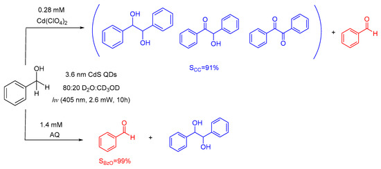 Selectivities achieved for either C–C coupling or oxidation of benzyl alcohol catalyzed by CdS quantum dots (QDs).