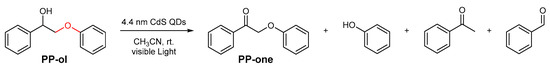 Cheng et al. [28] found that CdS QDs (diameter = 4.4 nm), as efficient photocatalysts, not only broke the β–O-–4 bonds in various lignin models (e.g., 2-phenoxy-1-phenylethanol (PP-ol)), but also transformed native lignin within biomass to functionalized aromatics under visible light without affecting other components in lignocellulose when they studied the full used of the lignocellulosic biomass (Scheme 4). The photogenerated electrons and holes of QDs about the cleavage of β–O–4 bonds were used fully. Additionally, a reversible aggregation-colloidization strategy could separate QDs from the reaction system and then be reused.