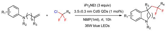 Feng et al. [32] presented the first example of photocatalyzed cyclization of functionalized difluoromethyl chlorides and inactivated olefins to afford the desired difluoromethylated products with CdS QDs (diameter = 3.5 ± 0.3 nm) as a photocatalyst (Scheme 5) by breaking the carbon(sp3)–chlorine bond of difluoromethyl chlorides. The reaction system could tolerate different difluoromethyl chlorides as fluorine sources and be appropriate for a series of substrates, which was efficient for preparing CF2-containing azaheterocycles.