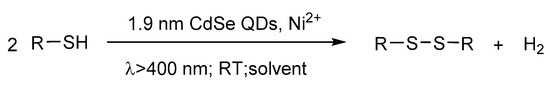 Wu et al. [33], in 2013, showed a highly-efficient and easily controlled process for the coupling of thiols using CdSe QDs (diameter = 1.9 nm) as a photocatalyst quantitatively and selectively, without sacrificial agents or oxidants. Usually, the synthesis of disulfides from thiols needs stoichiometric oxidants, such as Oxone or 2,3-Dichloro-5,6-dicyano-1,4-benzoquinone (DDQ) [34,35]. CdSe QDs are reusable and suitable for water systems and stable in some reactions under aerobic conditions. Ingeniously, CdSe QDs can absorb disulfides on the surface to keep them from oxidizing. This work also proposed the mechanism for photocatalytic transformation of thiols to disulfides and clear H2 (Scheme 6). The process can be facilitated by promoting H2 evolution with the addition of nickel (II) ions with the turnover number (TONs) of the QDs more than 2000. Isotope experiments showed that the hydrogen source was the solvent of water, not thiols in the H2 produced above.