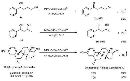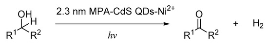 Then in 2017, Wu et al. [36] found that alcohols could selectively convert to aldehydes/ketones without external oxidants in water using 3-mercaptopropionic acid (MPA)-coordinated CdSe QDs (diameter = 2.3 nm) as a photocatalyst and hydrogen as the only by-product. (Scheme 7). The photocatalytic process is clean and highly efficient, with Ni2+ ions as cocatalyst. In this paper, a reactive radical was formed by a relay process with MPA, and water as relay reagents established a new opportunity to explore QDs as a photocatalyst for organic transformations. Additionally, benzyl alcohols were more easily oxidized compared with aliphatic alcohols, due to the less bond dissociation energy of the benzylic C–H bonds (Scheme 8).
