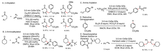 Early in 2017, Weix and Krauss [37] reported that oleate-capped CdSe QDs (diameter of about 3.3 nm) behaved well in visible-light-induced C–C bond-forming reactions. They then conducted five organic transformation reactions using lower loading of CdSe QDs to replace the traditional catalysts of Ru or Ir complexes (Scheme 9). In some cases, the TON and turnover frequency (TOF) already surpassed the best reported traditional dyes.