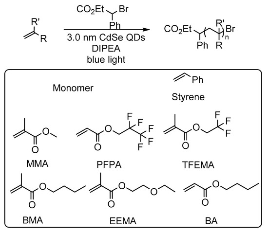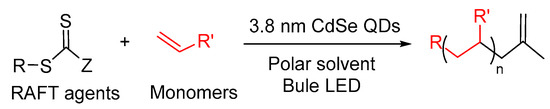 Egap et al. [38] reported that CdSe QDs (diameter = 3.0 nm) were successfully used for light-mediated radical polymerization of (meth)acrylates and styrene to construct block copolymers with high conversion and narrow polydispersity (Scheme 10). QDs were applied as a photocatalyst for atom transfer radical polymerization (ATRP) to achieve various types of polymerization reactions. The authors also pointed out that QDs are a promising catalyst in the field of photopolymerization due to their facile synthetic and purification preparation, low catalyst loading, and ability to easily tune redox and electronic properties.