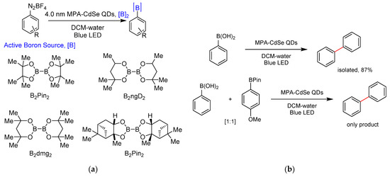 (a) The photocatalytic borylation of diazonium salts using MPA-capped CdSe QDs in water; (b) MPA-CdSe QDs catalyze the coupling of borylation.