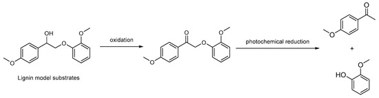 The reaction for the photocatalytic cleavage of β–O–4 bond in lignin model compounds.