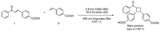Photoinduced enantioselective intermolecular [2+2] photocycloadditions have been extensively researched. Weiss et al. [41] achieved regioselective and diastereoselective intermolecular [2+2] cycloadditions of 4-vinylbenzoic acid derivatives using CdSe QDs (diameter = 2.8 nm) as photocatalysis (Scheme 13). Apart from acting as photosensitizer, the QDs here were also triplet exciton donors and self-assembly scaffolds, of which triplet energy was tunable by controlling QDs’ size to selectively sensitize one component among the reaction system of cycloadditions. In this case, 1.4 nm CdSe QDs selectively transferred energy to 1 without sensitizing 3, while 1.0 nm CdSe QDs and noble metal complexes could not achieve that (Scheme 13). Notably, CdSe QD photocatalysis provided non-normal syn products with a diastereomeric ratio of >40:1, while the metal complexes tended to generate antiproducts with diastereomeric ratio of <12:1. They found that it resulted from the carboxylate of the substrate absorbed to the QD surface, creating an intermolecular π–π interaction among the 4-vinylbenzoic acid derivatives occur. Additionally, head-to-head (HH) products or head-to-tail (HT) products were selectively generated by adjusting the position of carboxylate on the substrates. It was also associated with the interaction of the carboxylate and Cd2+ on the QD surface.