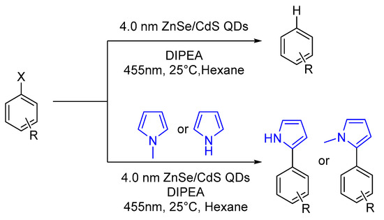 In the abovementioned reactions, plain-core QDs were used as photocatalysts. However, aggregation and etching strongly influence the stability of the plain-core QDs, so in most works, they are needed to design the ligands carefully in the reaction to improve the stability of the catalyst. The preparation of QDs into core-shell structures is an alternative way to stabilize QDs. In 2017, König and et al. [44] applied ZnSe/CdS core/shell QDs (diameter = 4.0 nm) as the photocatalyst to activate the C–X bonds to obtain arylation products. (Hetero)Aryl halides obtained electrons from the active QDs and then dehalogenations to form the corresponding (hetero)-aryl radicals. They followed by obtaining a hydrogen atom from the radical cation of DIPEA to be the reduced product, or to form the C–H arylated product with the participation of some pyrrole derivatives (Scheme 15).