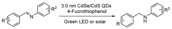 - Xi, Z.W.; Yang, L.; Wang, D.Y.; Pu, C.D.; Shen, Y.M.; Wu, C.D.; Peng, X.G. Visible-Light Photocatalytic Synthesis of Amines from Imines via Transfer Hydrogenation Using Quantum Dots as Catalysts. J. Org. Chem. 2018, 83, 11886–11895. [Google Scholar] [CrossRef] [PubMed]