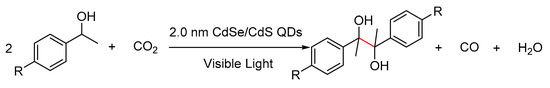 There are many reports on the photoreduction of carbon dioxide using quantum dots in the recent years. In 2019, Wu et al. [45] reported the combination of the photoreduction of CO2-to-CO conversion and oxidative organic transformation (Scheme 17). They used stable and high-activity CdSe/CdS core/shell quantum dots (diameter = 2.0 nm) as a photocatalyst to produce a gas product of CO and dimerization product of mono-alcohol simultaneously, which made full use of excited electrons and holes. It must be emphasized that appropriate introduction of CdS layers simultaneously facilitated CO2 reduction and Cα–H activation.