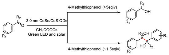 Later, in 2021, Shen et al. [46] used the same CdSe/CdS core/shell QDs (diameter = 3.0 nm) to selectively produce either alcohols or pinacol products from aryl aldehydes and ketones. Here, thiophenols are not only proton and hydrogen donors, but also the hole scavengers of the excited QDs.