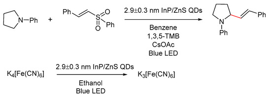 Although there have some exciting results reported using QDs as the photocatalyst for organic reactions, most of them used toxic metal-ion-based QDs such as cadmium. Even though the amount of catalyst is limited, it may cause some environmental problems. Some examples with more environmentally friendly QDs were demonstrated in recent years. In 2019, Pillai et al. [47] presented a C–C coupling reaction between 1-phenyl pyrrolidine and phenyl-trans-styryl sulfone, which was catalyzed by cadmium-free QDs InP/ZnS (diameter = 2.9 ± 0.3 nm) without cocatalysts or sacrificial agents. White-light illumination proved that InP/ZnS QDs can be used to solar photocatalysis. They also transformed ferricyanide to ferrocyanide with the help of anionic 11-mercaptoundecanoic acid-capped InP/ZnS QDs (Scheme 19).