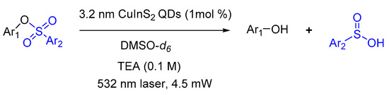 Recently, Weiss et al. [48] reported a photocatalytic deprotection of the aryl sulfonates by using CuInS2/ZnS core/shell QDs (diameter = 3.2 nm) as photocatalysts (Scheme 20). It was found that a substrate containing a QD-binding group improved the rate of deprotection. Thus, the substrate was easily absorbed on the surface of the QDs to promote the two electrons’ transfer. The results showed that the deprotection is selective. The sulfonyl groups with electron-withdrawing substituents are easily removed when they coexist with tert-butoxycarbonyl (Boc-) and toluenesulfonyl-protecting groups, even with proximate ketones.