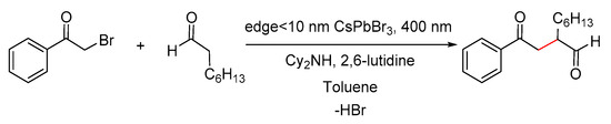 In 2020, Chen et al. [50] reported that they employed CsPbBr3 nanocrystals (NCs, edge length < 10 nm) of the longer-lived charge separated state to form a C–C bond between 2-bromoacetophenone and octanal (Scheme 22). In situ enamine formed by octanal and dicyclohexylamine had holes to generate radical cation, to create a reaction with acetophenone free radical that formed by 2-bromoacetophenone obtaining electrons from CsPbBr3 nanocrystals (NCs) and releasing bromine anions.