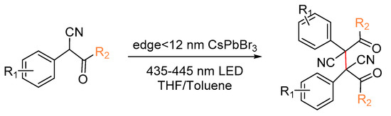 Very recently, Chen et al. [51] used zwitterionic ligand-capped CsPbBr3 perovskite QDs (edge length = 10.6 ± 1.2 nm) as photocatalysts to realize the stereoselective C–C oxidative dimerization of α-aryl ketonitriles. 3-(N,N-dimethyloctadecylammonio) propanesulfonate as the zwitterionic ligand not only overcame the QDs stability and reuse issues, but also reduced the reaction time and improved the yield while maintaining the high stereoselectivities (>99%) of dl-isomer. In addition, it was found that electron-donating groups on the para-position of the aryl ring or a larger conjugated π system was conductive to allowing dimerization to occur (Scheme 23).
