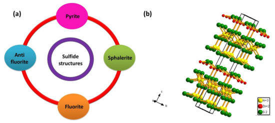 When a metal or semi-metal cation is combined with a sulfur anion, it forms a metal sulfide compound with a stoichiometry of MxSy (MS, M2S, M3S4, MS2). Bi-metal sulfides are formed in a similar approach with a stoichiometry of A1-xBxSy, where x and y are integers [57]. The occupation of metal and sulfur atoms in metal sulfide are arrangements of a close-packed system with four notable structures (Figure 1a). In the first case, we have a symmetrical sodium chloride (NaCl) structure type with each ion occupying an octahedron position with six nearest neighbors. It is called the pyrite structure when the crystal comprises two sulfide ions in each octahedron position [57,58,59]. Then we have the sphalerite structure where the metal ions are bounded by six oppositely charged ions positioned tetrahedrally [60]. The next important structure type is called the fluorite, in which every metal cation is surrounded by eight anions and every anion, in turn, is surrounded by four cations. If this symmetry is reversed with every metal cation surrounded by four anions and every anion, in turn, is surrounded by eight cations, then it is called the anti-fluorite structure [57,61].