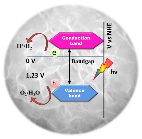 Photocatalytic water splitting is an energetically uphill reaction (Gibbs energy = 237 kJ/mol) which involves positive energy change and multiple electron transfer similar to naturally occurring photosynthesis. Hence, photocatalytic water splitting is often referred to as “artificial photosynthesis” [69]. Theoretically, a material possessing a minimum bandgap of 1.23 eV is suitable for photochemical water splitting, as explained in Figure 2 [16].