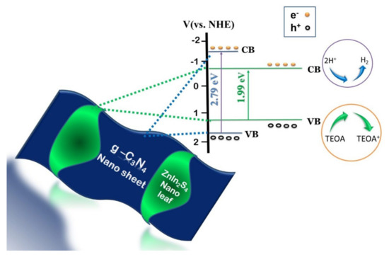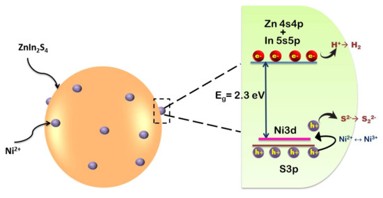 In a typical photo-assisted water splitting process, a photocatalyst is excited with energy greater than or equal to the band-gap value to generate electron–hole pairs. These photogenerated charge carriers would migrate to the surface of the photocatalyst and react with the organic pollutant. Photogenerated electrons would reduce H+ to H2 whilst the holes would be consumed by the sacrificial agent added to the system. Though its bandgap lies in the visible region, ZnIn2S4 suffers from recombination of charge carriers as well as poor migration [63]. In order to improve the photocatalytic performance of ZnIn2S4, several approaches have been made including the formation of heterostructure with a suitable photocatalyst, doping with metal ions, surface modification, control of morphology etc. These modifications aid in improving the surface and optical properties of ZnIn2S4 and escalating migration of charge carriers with lower recombination rate resulting in enhanced photocatalytic activity.