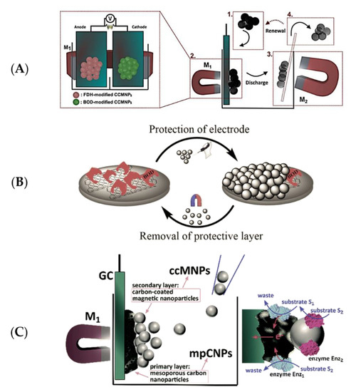 - Trifonov, A.; Stemmer, A.; Tel-Vered, R. Carbon-coated magnetic nanoparticles as a removable protection layer extending the operation lifetime of bilirubin oxidase-based bioelectrode. Bioelectrochemistry 2021, 137, 107640. [Google Scholar] [CrossRef] [PubMed]