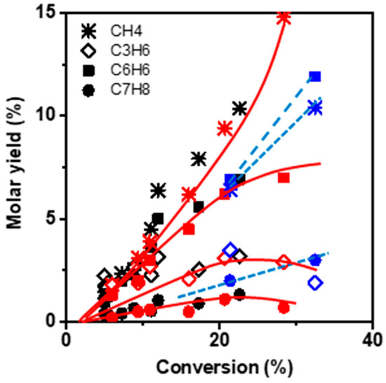 Besides, both propylene and toluene yields achieve a maximum of 20% conversion before stabilizing and finally declining (Figure 4). Therefore, CH4 does not result from a cracking mechanism but more likely from the dealkylation of toluene [2]. The aromatisation requires either an intra-molecular dehydrogenation (DH: ) or an inter-molecular hydrogen transfer (HT: ). The HT mechanism involves alkanes as by-products; thereby, it is possible to identify which mechanism is at work by tracking the production of alkanes. In the present case, the alkane yield at low conversion is low, while at high conversion values, the alkanes (mainly ethane) yield becomes significant and further grows with increasing TOS (Figure S2, in Supplementary Materials). This change indicates that deactivation results from the formation of less reactive molecules catalysed on BAS.