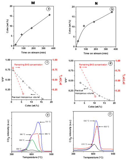 Coke content as a function of time-on-stream on the micro- (a) and nano-(b) sized zeolites. Residual micropore volume and BAS as a function of coke content on M (c) and N (d) catalysts. CO2 profile of coke combustion as a function of oxidation temperature for spent M (e) and N (f) catalysts after several time-on-stream values (black = 20 min, green = 80 min, red = 180 min, blue = 360 min).