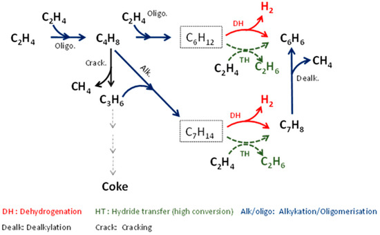 Keeping the crucial role of HCP in mind, coke formation during EDA can result in catalyst deactivation [11]. Indeed, as light alkenes undergo fast condensation reactions (oligomerisations, polymerisations, cyclisations, hydrogen transfers, etc.), heavy products, which remain trapped within the zeolite micropores, can be formed [12,13]. On the opposite, benzene, toluene, and even naphthalene are much less reactive in acid catalysis, as they are neither bulky nor basic enough to be irreversibly retained on the zeolite catalyst. Moreover, thermal oligomerisation and (or) cracking of ethylene is thermodynamically more favourable than poly-condensation of benzene at 700 °C. Song et al. confirmed ethylene as the main coke source using a three-layer fixed-bed mode reactor [14]. In brief, coking results from the transformation of olefins, which are intermediate products of the ethylene aromatisation, rather than from BTX polymerisation.