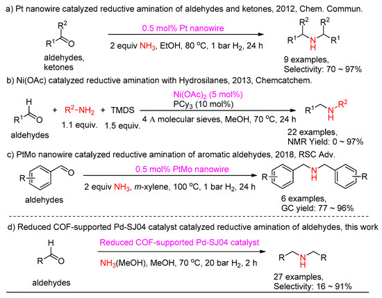 - Qi, F.; Hu, L.; Lu, S.; Cao, X.; Gu, H. Selective synthesis of secondary amines by Pt nanowire catalyzed reductive amination of aldehydes and ketones with ammonia. Chem. Commun. 2012, 48, 9631–9633. [Google Scholar] [CrossRef]