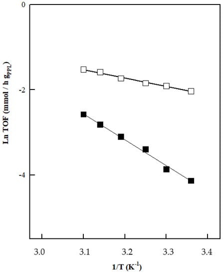 The activation energy (Ea) has been calculated from TOF values of acetophenone and propiophenone (Table 6), using the Equation (1):