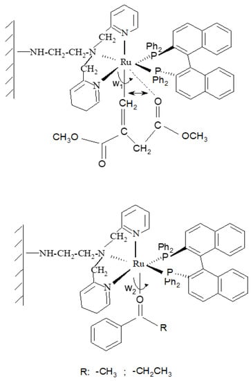 In the dimethyl itaconate molecule, the W1 bond angle provides an important steric limitation. However, in the hydrogenation of C=O bonds of acetophenone and propiophenone, the angle W2 (Figure 2) has no steric limitations due to a secondary interaction of orbitals of the functional group nearby. Nevertheless, some steric effects in the activated intermediate can be corroborated, since the substitution of a methyl group for an ethyl one promotes an asymmetric induction effect (the ee values go from 4–6% to 19–23%).