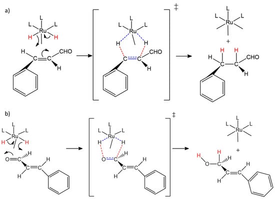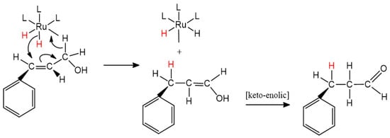 Therefore, the hydrocinamaldehyde obtained together the cinnamic alcohol, in the hydrogenation of cinnamic aldehyde, is not produced by the hydrogenation of the olefinic double bond in the substrate molecule, but it is a result of the catalyzed isomerization of cinnamic alcohol, obtained by hydrogenation of the carbonyl group. Thus, the initial step is the hydrogenation of cinnamic aldehyde’s carbonyl group, Figure 3b, who becomes hidrocinamaldehyde by 1,3 sigmatropic transposition catalyzed by the activated Ru complex, Figure 4, whose carbonyl group is then hydrogenated to get 3-phenyl-1-propanol, as it is indicated in the overall process, in Figure 5.