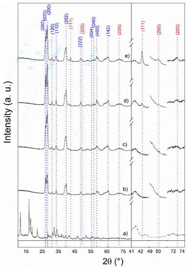 The XRD patterns of Cu2O(x wt %)/WO3 nanocomposites are shown in Figure 1c–e. For comparison, the XRD patterns of peroxotungstic acid precursor (PTA) and pure WO3 are also given. Diffractogram of PTA in Figure 1a exhibits typical features for layered compounds with intense diffraction peaks in the range of small Bragg angles. Similar diffraction patterns for [WO2(O2)H2O]·nH2O precursor were reported by other authors, although the positions of individual peaks may slightly vary depending on the degree of hydration [28]. The as-prepared WO3 powder diffraction pattern is identical to the reported monoclinic phase in PDF Card No. 01-072-0677. The most pronounced peaks were indexed to (002), (020), (200), (120), (112), (202), (222), (004), (040), and (142) planes. The monoclinic I (γ-WO3) phase was thermodynamically stable in the range from 17 °C to 330 °C. No traces of triclinic (δ-WO3) phase were observed, although its stability region (from −43 °C to 17 °C) was very close to the room temperature [36,37]. From Figure 1c, it can be observed that when the amount of Cu2O was 1.0 wt %, the diffraction peaks corresponding to the cubic phase of Cu2O were not manifested (PDF Card No. 01-078-2076). Nevertheless, by increasing the content of Cu2O to 5.0 wt % and 10.0 wt %, we found that the diffraction peak intensity corresponding to Cu2O planes increased significantly (see magnified parts of the diffractogram in the right part of the graph in Figure 1). No other crystal phases, namely, CuWO4, were found in the nanocomposite samples.