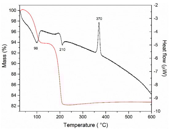Thermogravimetric (TG)/differential scanning calorimetry (DSC) analysis of peroxotungstic acid precursor (PTA) (WO3 precursor). The red line and black line denote TGA and DSC, respectively.