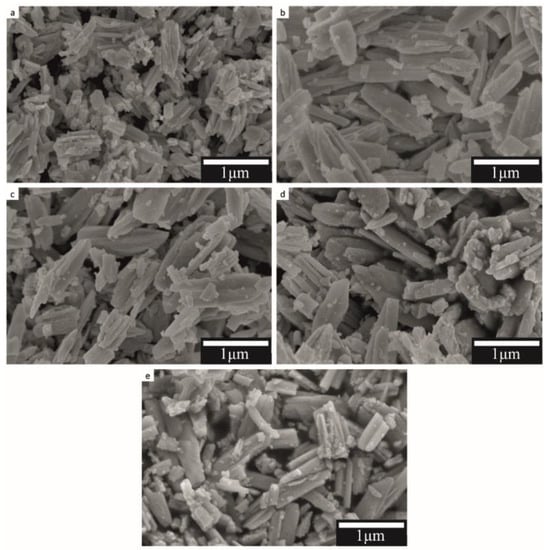SEM was used for the characterization of as-prepared samples to observe the surface morphology and features. The SEM images revealed that compared to PTA precursor in Figure 4a, which contained rough bundle-like agglomerates, the as-prepared WO3 crystals exhibited very similar yet several times coarser bundle-like agglomerate morphology, which is shown in Figure 4b. This can be due to the growth of the crystalline phase at the expense of the precursor. A closer inspection shows nanoplate-like morphology WO3 crystals, which might be inherited from the original layered PTA structure. On the other hand, all diffractions at low 2θ angles corresponding to the layered structure of PTA vanished in the diffractograms of the calcined products. It should be stressed that the thermal decomposition of the PTA precursor resulted in the amorphous intermediate first, which was then followed by the crystallization of the WO3 phase, as confirmed by the combined TG/DSC analysis and literature data [36]. Therefore, the WO3 nanoplates were much coarser than the PTA layers should be, and it cannot be a topotactic transition. These WO3 crystals were further used in the preparation of Cu2O/WO3 composites. Figure 4c–e shows the SEM images of Cu2O/WO3 composites with 1, 5, and 10 wt % of Cu2O, respectively. The overall morphology of the WO3 nanoplate aggregates was not affected by the mechanical operation. SEM images also indicate that a large number of Cu2O nanoparticles were assembled on the surface of WO3 nanoplates. No separated aggregations of Cu2O nanoparticles were observed. Moreover, the size of the Cu2O nanoparticles on the surface of WO3 appeared to be uniform for each concentration. As expected, with an increasing amount of Cu2O decoration onto WO3 surface, higher coverage of the surface of WO3 nanoplates by Cu2O nanoparticles was achieved. This uniformity of Cu2O decoration on WO3 may favor improved charge transfer, resulting in enhanced photocatalytic activity.
