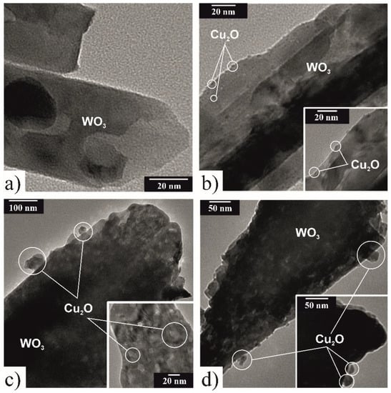 The interface and microstructure features of the Cu2O/WO3 heterogeneous structure were further studied by TEM. Figure 5a–d shows the TEM images of the as-prepared WO3 nanoplates and Cu2O/WO3 heterogeneous nanostructures with 1, 5, and 10 wt % of Cu2O, respectively. As shown in Figure 5a, pure WO3 nanoplate aggregates were composed of crystals with plate-like morphology as previously observed by SEM images. Figure 5b–d shows the TEM images of as-prepared Cu2O/WO3 heterogeneous nanostructures with different weight concentrations. It was observed that very small Cu2O particles in 1 wt % nanocomposite (Figure 5b) were sparsely distributed on the surface of WO3 grains with good interfacial contact with WO3. The size of these Cu2O particles may be estimated below a few nanometers. This is in accordance with their virtual invisibility in the X-ray diffractogram, also considering the small concentration of the phase. Much dense decoration surface coverage and bigger particles can be seen in Figure 5c,d. The size of the biggest nanoparticles reached a few tens of nanometers, which is in accordance with the XRD results. Nevertheless, medium-size and very small particles were present as well, implying wide size distribution, which might be a result of the rapid and short annealing of the solid-state mixture of WO3 and the cupric oxide precursor. The shape of decorating particles also seems to be variable. The TEM analysis showed that the surface of relatively big WO3 nanoplates was covered by tiny Cu2O nanoparticle decorations, which can enhance the charge transfer efficiency due to the improved formation of hetero-junctions.