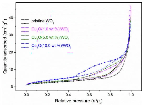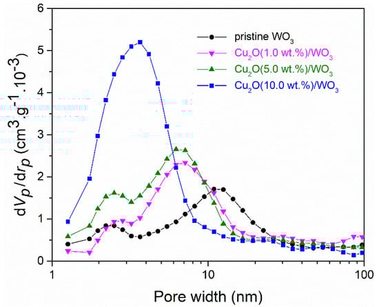 The specific surface area estimated according to BET (Brunauer, Emmett and Teller) analysis and porosity of the prepared photocatalysts were investigated by nitrogen adsorption–desorption. Figure 6 and Figure 7 show the nitrogen adsorption–desorption and the corresponding pore-size distribution, respectively. The BET surface areas of prepared Cu2O (x wt %)/WO3 were 9.1, 10.7, 11.3, and 14.3 m2 g−1 with the weight percent values of x = 0.0, 1.0, 5.0, and 10.0, respectively. With the increasing concentration of Cu2O, the surface areas of the samples slightly increased. Increasing specific surface normally implies enhancement in photocatalytic activity due to a higher number of available active sites [41]. Systems with the hierarchical porous structure may obey this simple law in specific cases [42] when the surface area is the only difference between compared materials, while the interplay of the effects of the structural features contributing at various morphology hierarchical levels can be more complicated [43]. It can be observed that all prepared photocatalysts exhibited type IV isotherm according to IUPAC (International Union of Pure and Applied Chemistry) classification, implying the presence of mesoporous structure. At the relative pressure range of 0.5–0.9, the shape of the hysteresis loop of samples was that of type H3, indicating the presence of slit-like pores [44]. The mesoporous pore-size distribution was very broad and ranged from 2 to 60 nm. The pore volume distribution curve had a bimodal characteristic with the main maximum of the pore width about 10 nm and a smaller peak at about 2–3 nm for pure WO3. The addition of Cu2O decoration did not influence the position of the smaller peak, but the main maximum was shifted to lower values (6–7 nm) for Cu2O (1 and 5 wt %)/WO3 nanocomposites. The two peaks merged into one with the maximum of pore width at 2 nm for Cu2O (10 wt %)/WO3 nanocomposite.