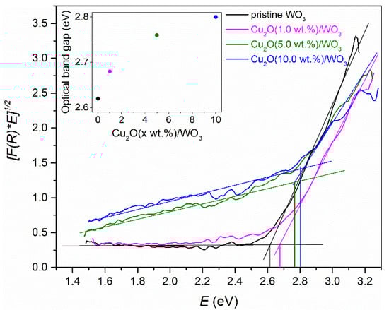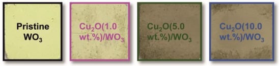 By plotting [F(R)·hν]1/2 vs. hν, as shown in Figure 8, the optical band gap energies of the materials were determined by the extrapolation of the slope to F(R) → 0 after subtraction of the baseline given by the low energy component [38]. The optical band gap energies of the as-prepared pure WO3, 1.0, 5.0, and 10.0 wt % Cu2O/WO3 were estimated to be 2.62, 2.68, 2.76, and 2.8 eV, respectively (Figure 8, inset) which is in accordance with the value 2.7 eV for pure monoclinic WO3 phase in the literature [37,48]. Moreover, the dependence may have only been a systematic manifestation of the inevitable error caused by subtraction of the increasing background baseline. Therefore, the value 2.7 eV was taken into further consideration for the WO3 component. If there was only the absorption due to the band gaps of WO3 and Cu2O, the material was of yellow color, having the absorption edge at about 470 nm. Figure 9 shows a visual representation of gradual color change with respect to increasing Cu2O concentration. It was observed that the pure WO3 powder was yellow as expected, and the addition of minute (1 wt %) amount of Cu2O caused only a brownish tint to the base WO3 yellow color, while a significant color change to brown was observed for Cu2O(5.0 wt %)/WO3 and Cu2O(10.0 wt %)/WO3 samples. The low energy component of the light absorption was manifested clearly in Figure 8. It must be noted that the bandgap of Cu2O was expected to be ≈2.2 eV [49,50], but the data did not allow its separation in the Tauc plot. This bandgap edge was buried in the pronounced tail located below 2.7 eV and ranging down to least 1.4 eV. The tail indicated the presence of significant structural imperfections, lattice disorder, and eventually amorphous phase (or phases), which was in accordance with the peak broadening observed by Raman spectrometry. The structural disorder may have arisen from at least two sources. First, the specific method of synthesis included quick annealing, fast decomposition of the material, and its ballistic cooling, which can produce a large number of frozen defects. Moreover, the generally substantial nanoparticle surface to volume ratio of the material itself made surface defects into existence inevitable. The distribution of these states in the bandgap did not fit to the standard exponential models describing Urbach energy [51,52], which is otherwise normally used to characterize the degree of disorderliness of the material. Therefore, we assume that band bending and band matching between the two semiconductors also may have contributed to the density of the widely distributed deep states in the band gap, specifically at 5.0 and 10 wt % Cu2O concentrations in the nanocomposite.