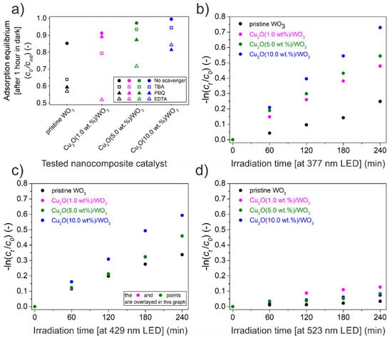 First, the effect of the scavengers on the adsorption of the testing molecule must be examined. Equilibrated concentrations of MB in tested solutions after 1 h in the dark are plotted in Figure 10a by hollow symbols. The addition of the scavengers resulted in the enhancement of the adsorption of MB onto the surface of the photocatalyst. Moreover, here, the effect diminished with increasing concentration of the Cu2O in the nanocomposite.