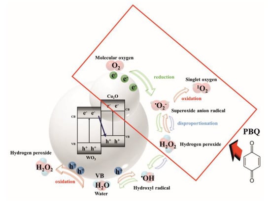 For superoxide ion (•O2−) quenching, PBQ as a scavenger was added to the reaction solution. The principle of its effect is illustrated in Scheme 3. As seen in Scheme 3, the addition of PBQ resulted in an overall increase of photocatalytic activity but gradually reduced with an increasing concentration of Cu2O in the nanocomposite. This result was counterintuitive. It should be noted that the superoxide anion was the first one in the cascade of the ROS formation. Thus, the reductive path of degradation was blocked from the very beginning. The role of this blocking effect would increase with the concentration of Cu2O, and this was indeed observed. On the contrary, the oxidative pathway would not be influenced by the PBQ and even enhanced due to increased MB adsorption (as observed, cf. Figure 10a). A compromise between these two effects would explain the maximum rate observed for Cu2O(1 wt %)/WO3 nanocomposite.
