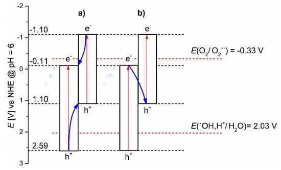 As indicated in the experimental section, the photocatalytic tests were performed at a mild condition of pH = 6. Henceforth, the values of band edge energies and potentials at pH = 6 are considered. The values ECB(WO3),pH = 6 = −0.11 eV, EVB(WO3),pH = 6 = 2.59 eV, ECB(Cu2O),pH = 6 = −1.10 eV, and EVB(Cu2O),pH = 6 = 1.10 eV were estimated applying Equation (6). These values were presumed to be the best guess that can be given according to the state of the art with the full awareness of possible errors, namely, the influence of the adsorption phenomena and all theoretical and experimental uncertainties of the values included in the model.