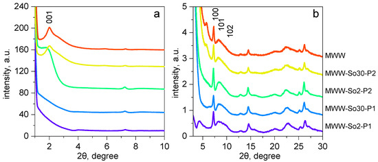 X-ray powder diffraction (XRD) patterns of the studied MWW zeolites in the range (a) 2θ = 1–10°, (b) 2θ = 3–30°.