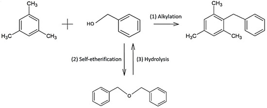 The goal of pillaring is an enhancement of mesoporosity to increase activity towards larger molecules. To evaluate this result, the Friedel-Crafts alkylation of mesitylene with benzyl alcohol was carried as the model test reactions. The main product in this reaction is 2-benzyl-1,3,5-trimethylbenzene (BTB), with dibenzyl ether (DBE) being the only side product (Scheme 2).