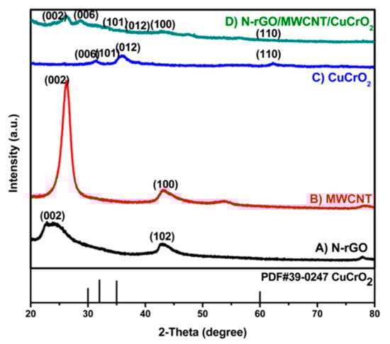XRD spectra of (A) N-rGO, (B) MWCNT, (C) CuCrO2 and (D) N-rGO-MWCNT/CuCrO2.