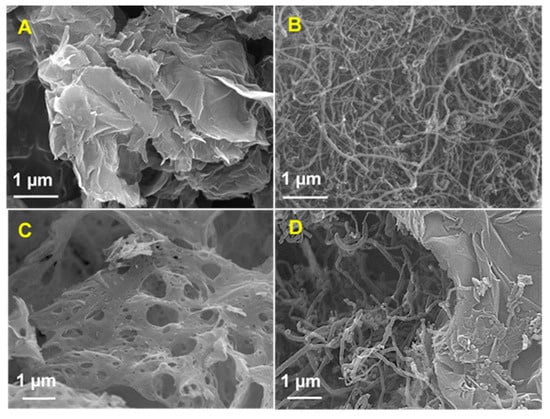 FESEM image of (A) N-rGO, (B) MWCNT, (C) CuCrO2, and (D) N-rGO-MWCNT/CuCrO2 composite.