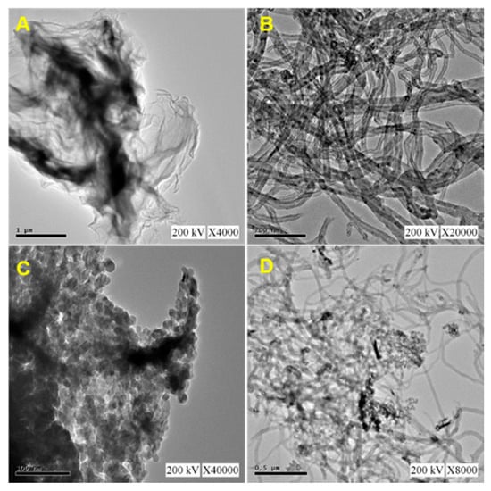 TEM images of (A) N-rGO, (B) MWCNT, (C) CuCrO2 and (D) N-rGO-MWCNT/CuCrO2.