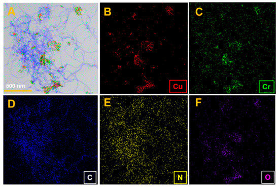 (A) STEM image of N-rGO-MWCNT/CuCrO2 composite and STEM-EDS spectra of (B) Cu, (C) Cr, (D) C, (E) N and (F) O.
