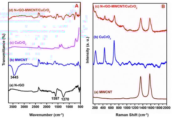(A) FT-IR spectra of (a) N-rGO, (b) MWCNT, (c) CuCrO2, (d) N-rGO-MWCNT/CuCrO2 composite. (B) Raman spectra of (a) MWCNT, (b) CuCrO2, (c) N-rGO-MWCNT/CuCrO2 composite.
